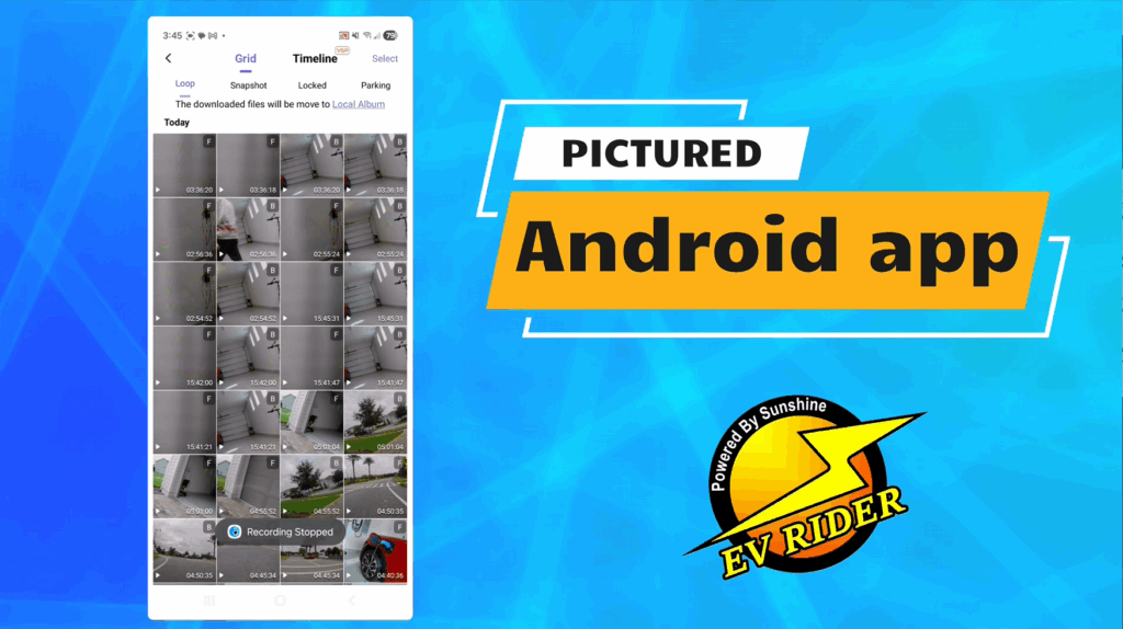 The cameras also record sound. They can be viewed while riding in either widescreen (front or rear) or split-screen (front & rear) view. The videos can be downloaded directly to your Apple or Android smart phone via a wifi-connected app that can be downloaded by scanning a QR code in the included installation manual. Videos can also be played back directly on the unit’s screen when stopped.
