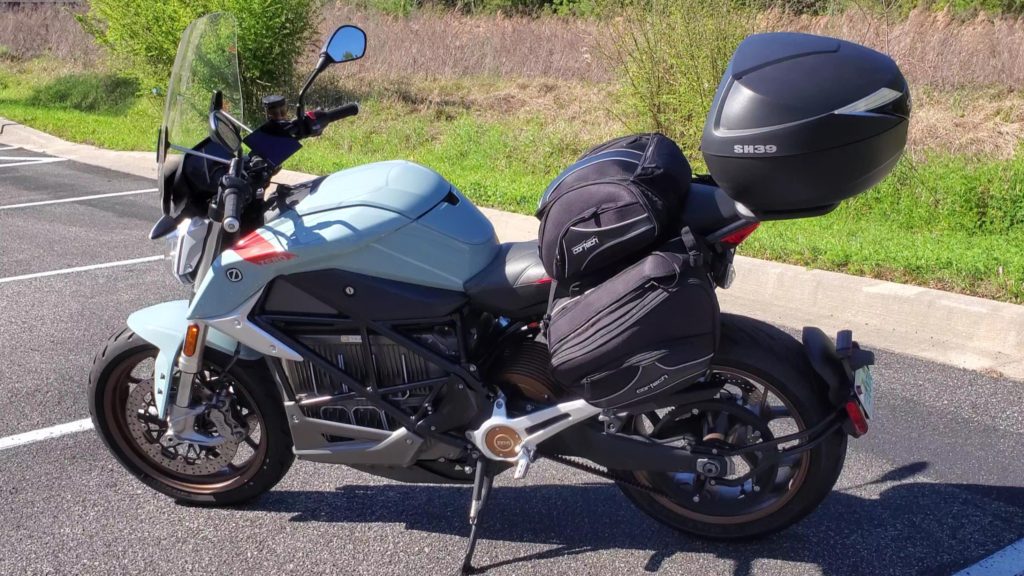 The writer’s 2020 Zero Motorcycles SR/F with Cortech Super 2.0 36L Saddlebags and Super 2.0 24-Liter Tail Bag is pictured.