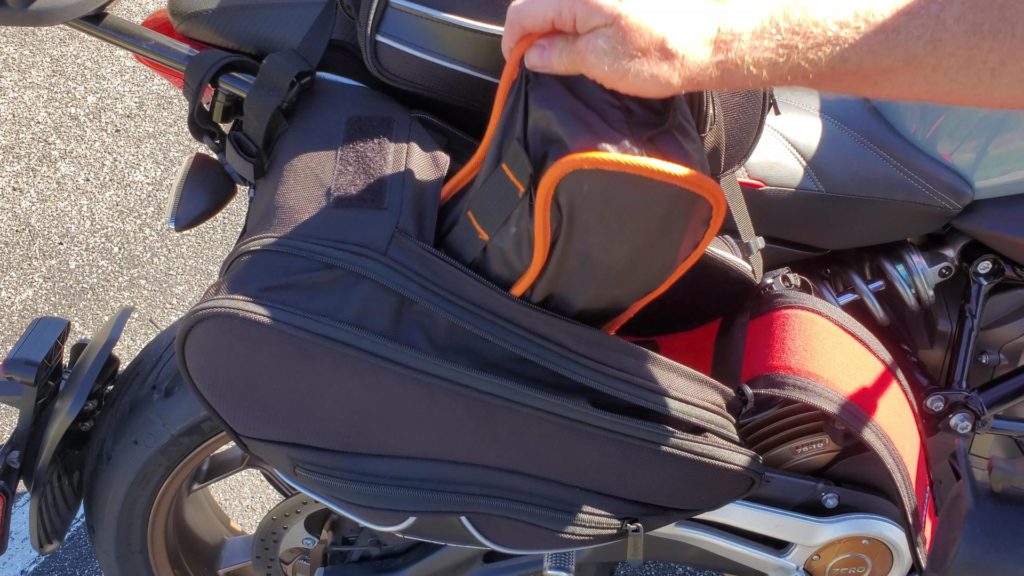 Next up was the way the saddlebags integrate with Cortech’s Super 2.0 24-Liter Tail Bag.