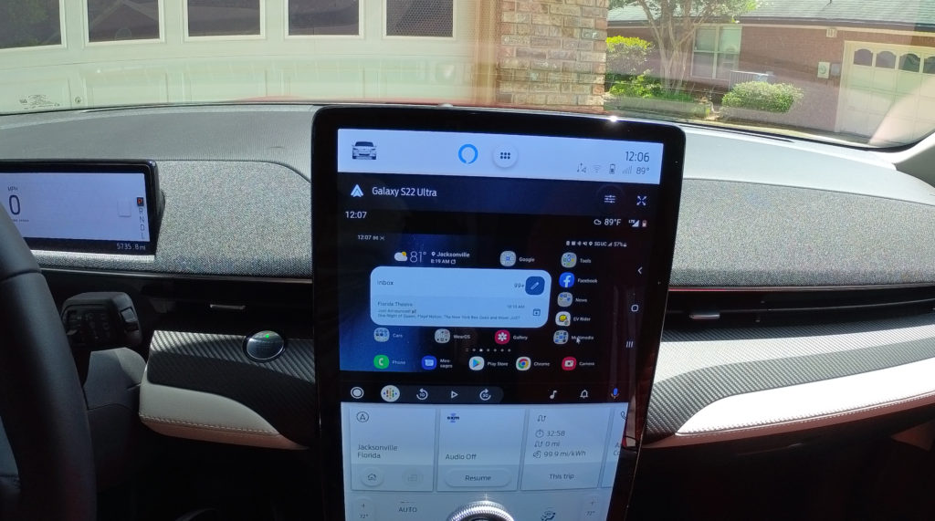 This opens up a world of productivity options since most Android apps will work properly while being mirrored. I have a Bluetooth keyboard and a Bluetooth mouse which allows me to quickly type and navigate between apps such as Microsoft Word or Excel while parked and charging my EV back up.