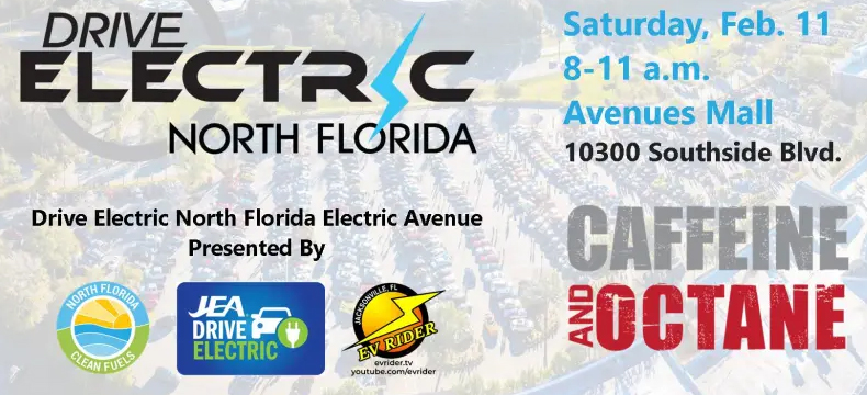 Drive Electric North Florida’s Electric Avenue at Caffeine and Octane is being presented by EV Rider, North Florida Clean Fuels and JEA’s Drive Electric.