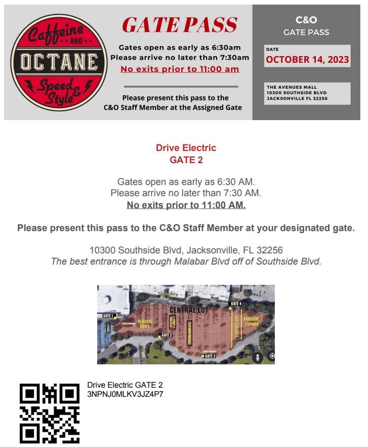 EV owners: when you arrive tell the attendant you have an EV to display at Electric Avenue and you’ll be directed to the proper lot. Participants are asked to keep their EVs on display until 11 a.m. Here’s the official Gate Pass for the Electric Avenue section that you can show the attendant: