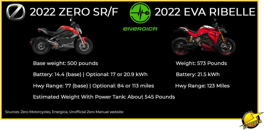 The 2022 Eva Ribelle weighs 573 pounds while a SR/F weighs 500 pounds. But the Ribelle comes with a standard 21.5 kWh battery.