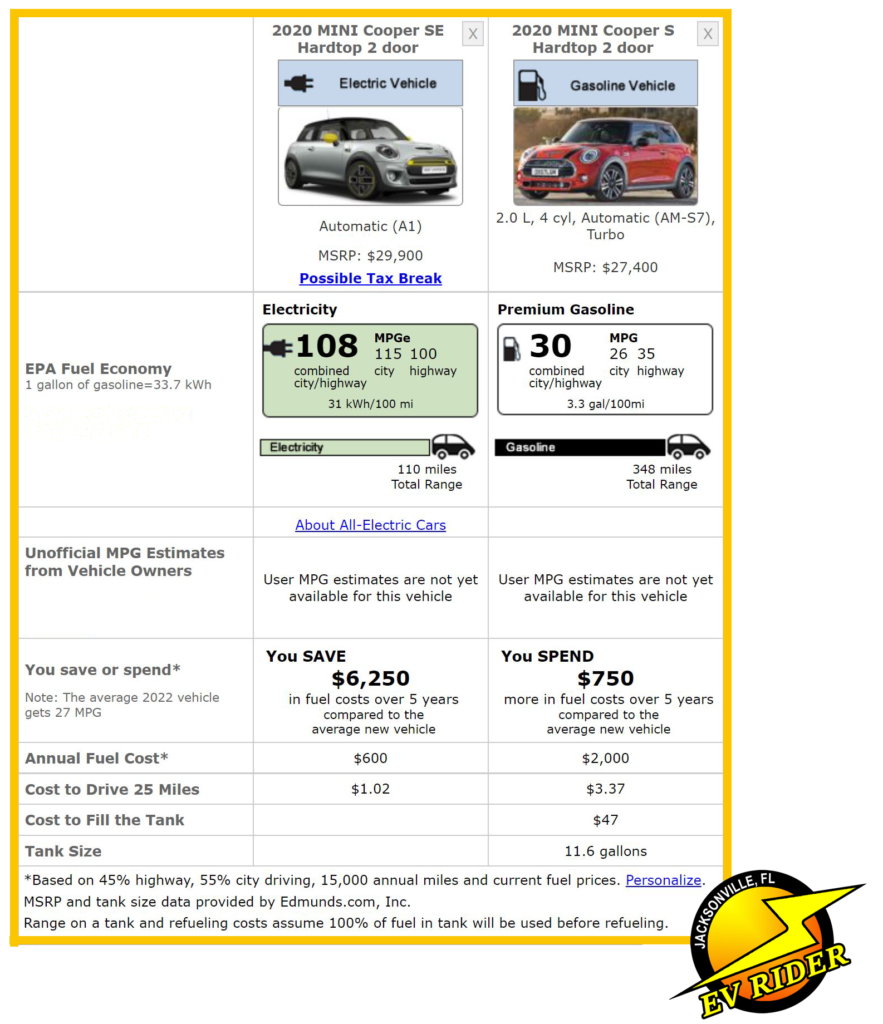 The EPA estimates the gas Mini’s fuel costs over the course of a year at more than triple the Mini EV’s fueling cost – at $2000 versus $600.