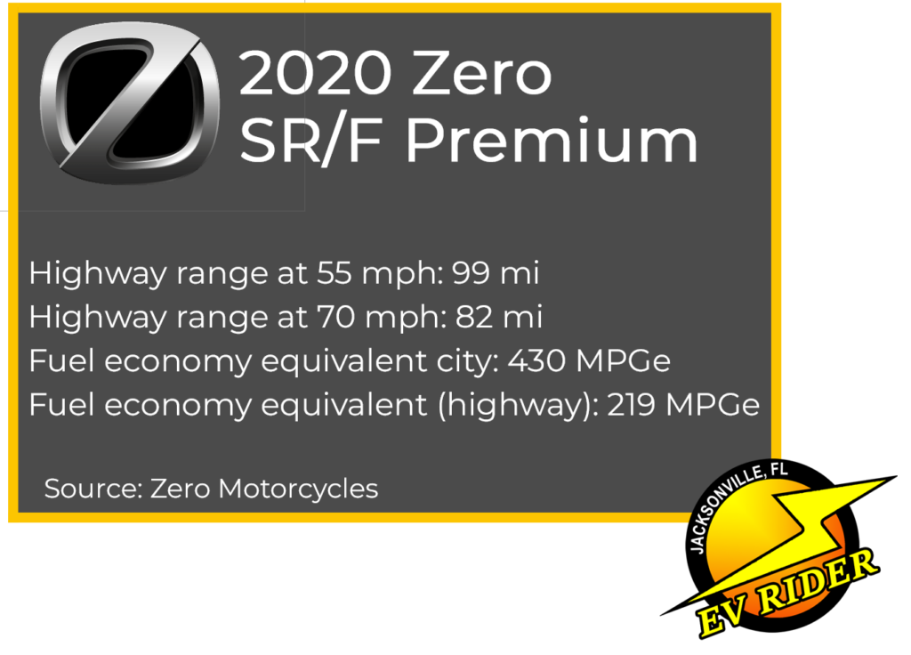 Zero estimated the 2020 SR/F could go 82 miles per charge at 70 mph, which I’ve found to be about right. The SR/F’s  exact range depends on weather conditions, hills and so on.