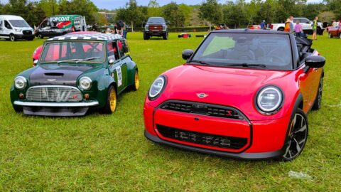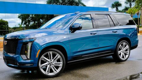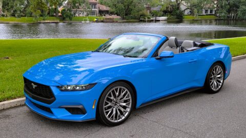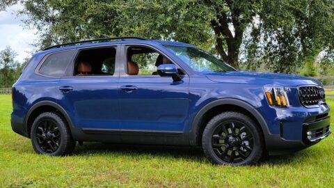 Parked with some new and classic Dodges at a recent cruise-in in Jacksonville, FL’s suburban Fruit Cove neighborhood, this 3-row SUV came in a Night Moves metallic blue paint job with black satin-painted aluminum hood. That’s a 1971 Dodge Demon behind EV Rider’s Durango test vehicle, which got compliments. Yes, its black grille with LED-framed projector beam headlights hasn’t changed in recent years, and neither has its aggressive, deep lower intake with serious chin spoiler and functional side intakes.