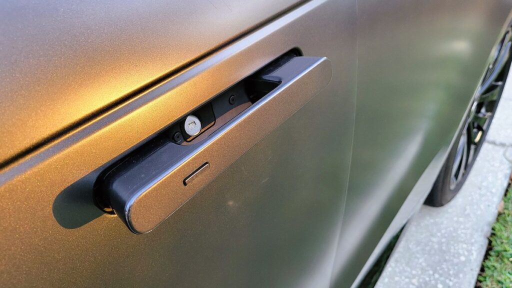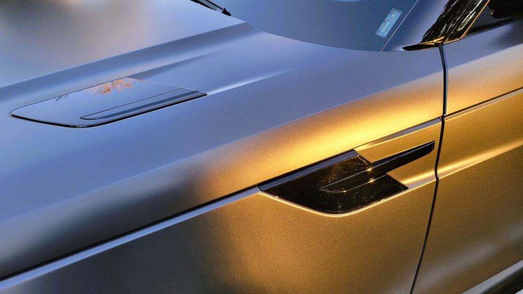Faux black vents add surface tension to bonnet and fenders, with a bit of gloss on the matte paint job. It’s the only other shine on lower door sills that flare nicely under gentle side lines. Flush door handles pop out and light up when you unlock, although a frosty morning had me wonder if ice could thwart that in colder climates.