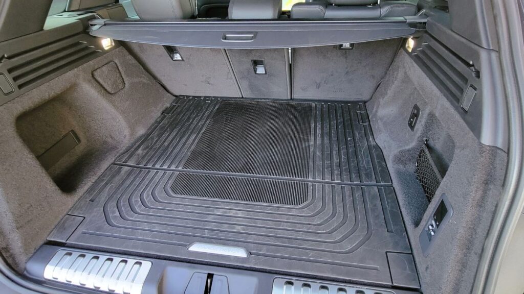 The rear bench has great head room under a second moonroof, after a slight duck under tapering roof line. There’s adequate knee space as well as power reclining seatback, full climate controls, and armrest with cup holders. The power rear hatch opens high to access a 31.9-cu.ft. storage area, with cargo area buttons to lower the 60/40 split seatbacks. And like a real off-roader, there are black rubber mats for human feet and the cargo area.