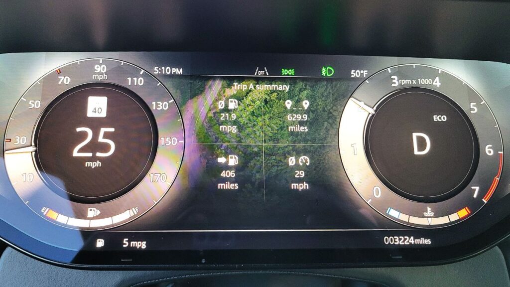 Range Rover Sports can be had with gas hybrid engines, a plug-in hybrid, or our tester’s BMW-sourced twin-turbocharged 4.4-liter V-8 with 523 hp, 553 lb. ft. of torque, and an 8-speed automatic transmission. There’s multi-mode four-wheel-drive with low range, hill descent and dual locking differentials. And there’s Eco, Normal, Dynamic and multiple off-road drive mode settings as well as a Sport Shift mode.