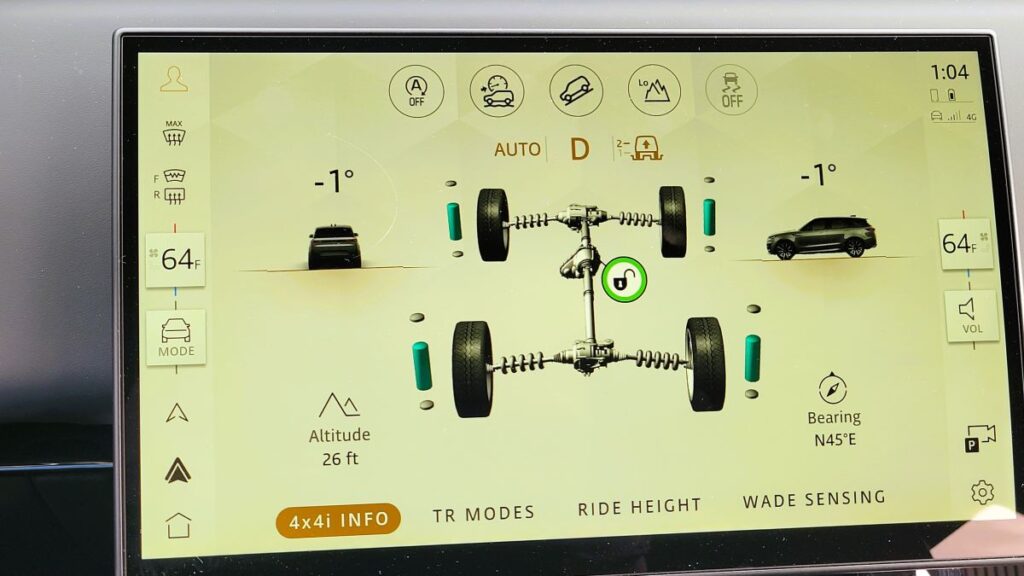 A unique main screen option shows a simulation of what’s under the hood so you can “see” what you’re going over. There are displays for altitude, front and center diff lock status, steering angle, and roll angles. It also shows steering angle and hill descent control.