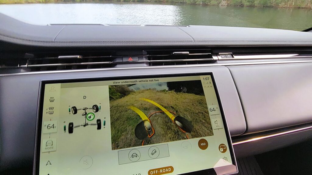 Maximum off-road height is 11.1 inches and is accomplished with a screen tap. Even with street-biased Pirellis, I tackled some rutted sand and bumpy grass and it went everywhere we pointed it with no slip. It had a refined ride over ruts. I’m told that it can also wade up to 2-ft., 8 in. deep. It raises from 8.5 inches of ground clearance to its maximum in seconds and does so automatically in some off-road modes.