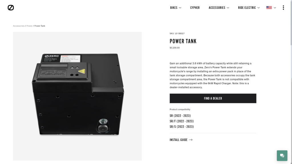 Next, let’s look at Zero’s Power Tank. It weighs roughly 45 pounds and adds 3.6 kWh of capacity, which on something as small as a SR/S motorcycle is good for roughly an extra 20 miles of highway range and more in the city. In the case of Zero, the additional battery is a permanently installed dealer accessory. It cost $3,200 at the time of this video’s posting and is offered as an option on most models. But that price doesn’t include the installation labor.